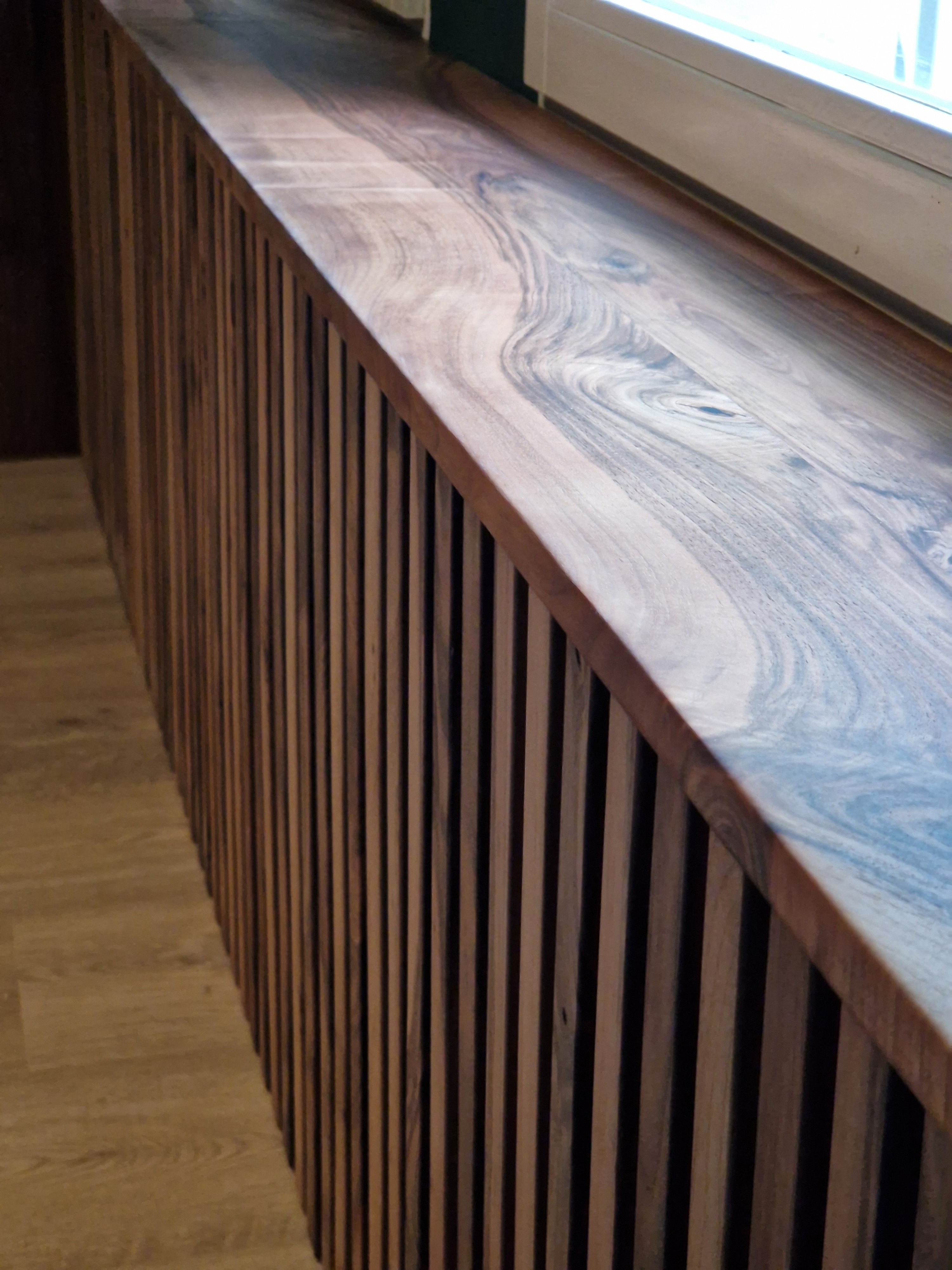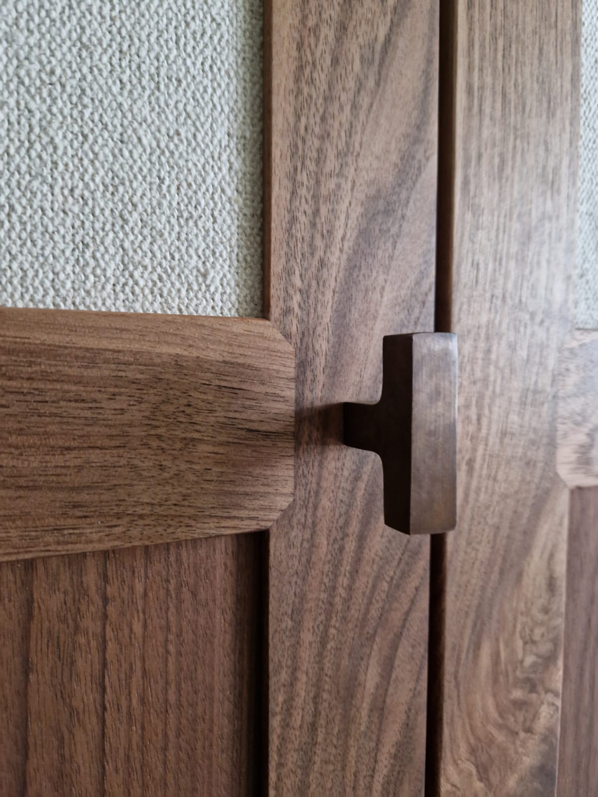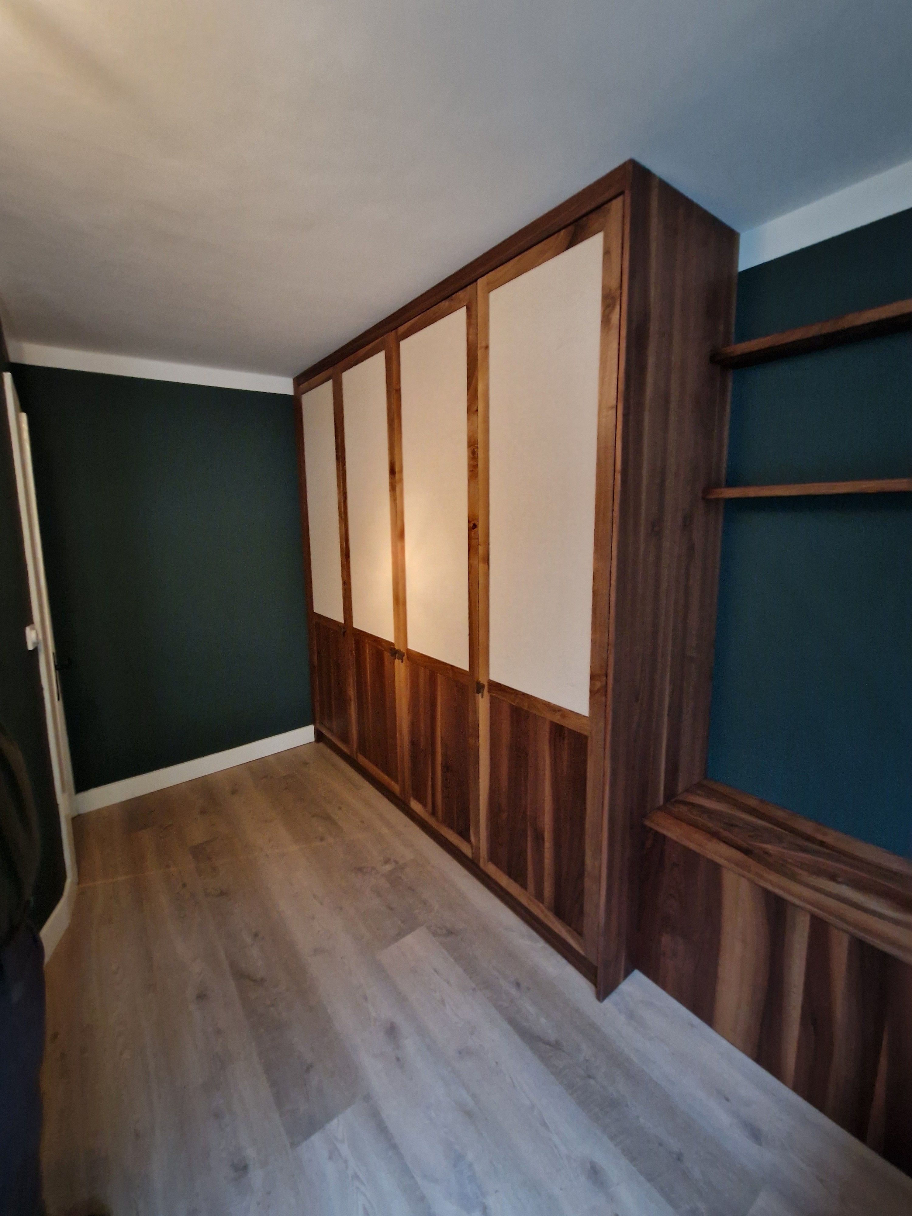 A custom-designed wardrobe system crafted in rich walnut, seamlessly integrating storage with a window-side bench. The piece features elegant cotton twill panel inserts that add texture and visual lightness to the sliding doors, beautifully contrasting with the warm walnut frame.