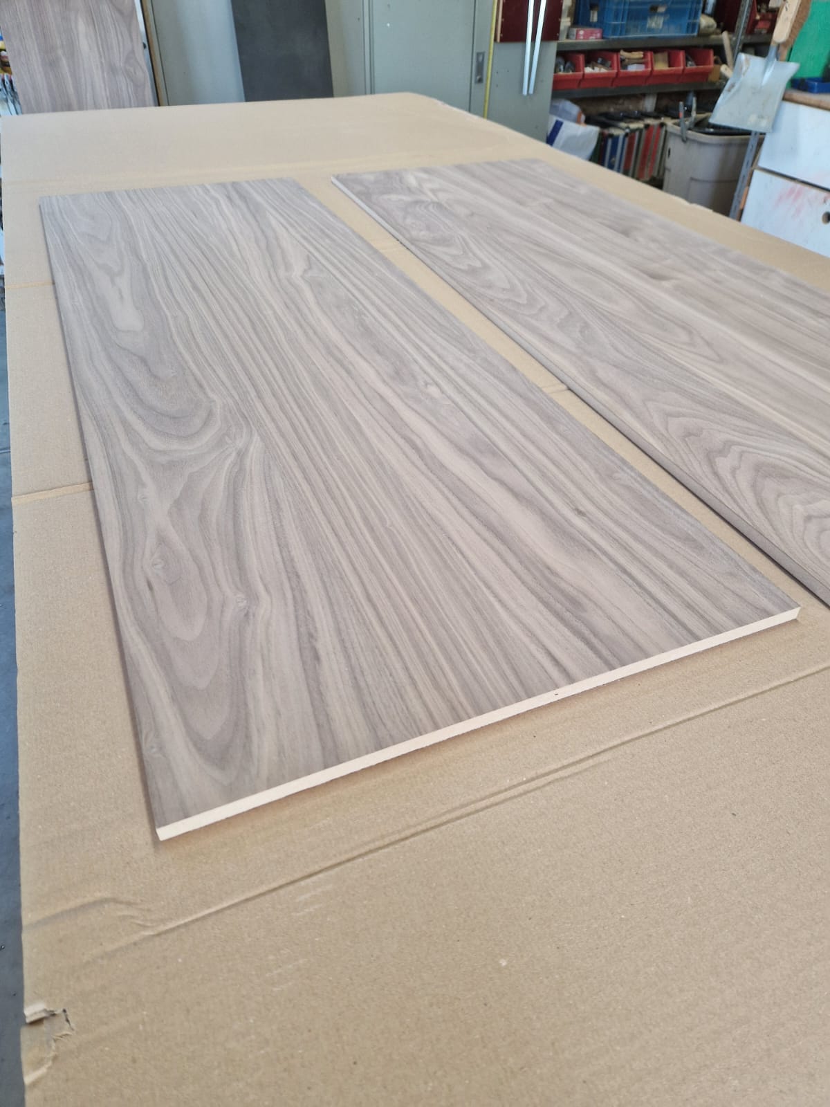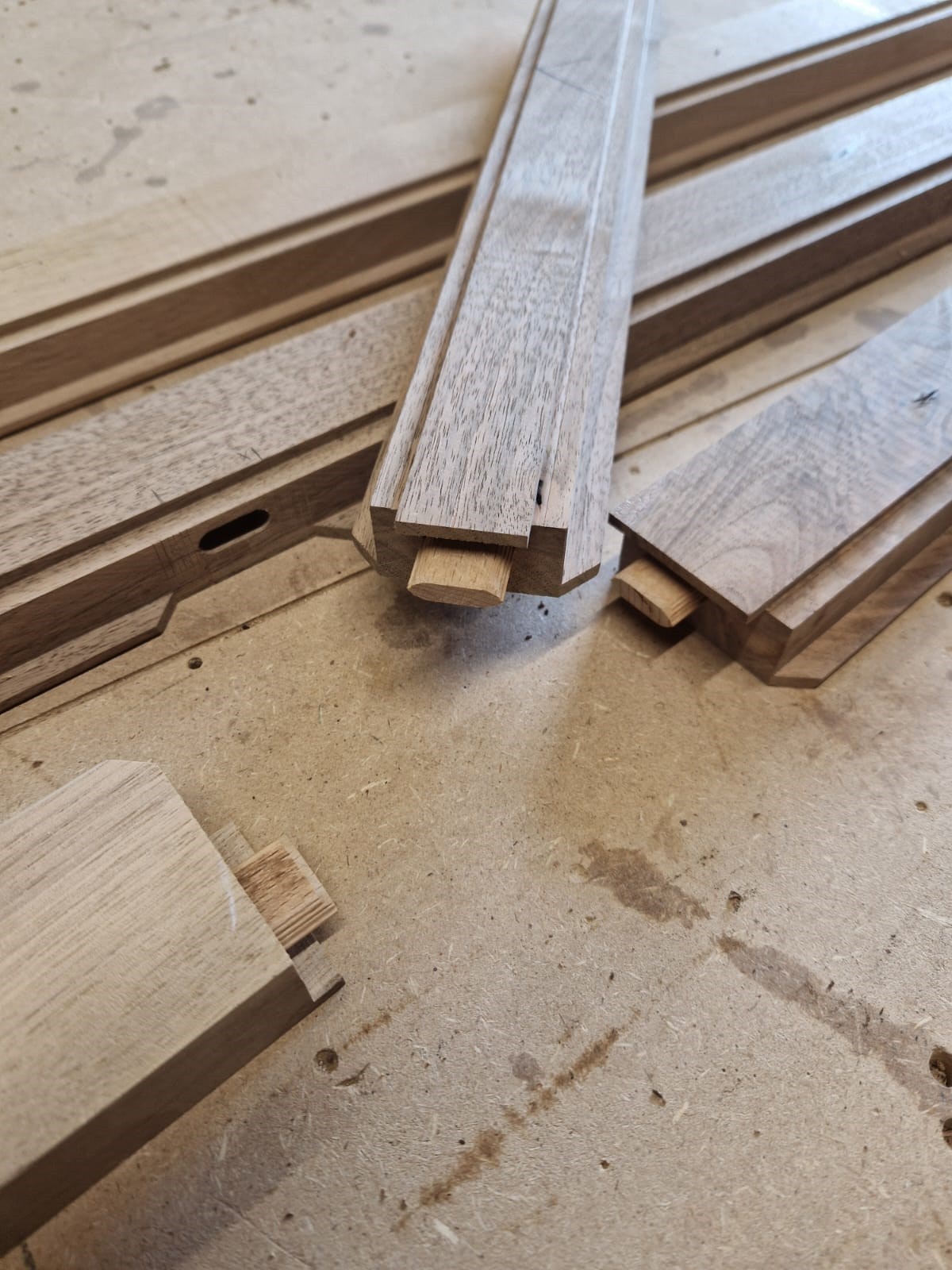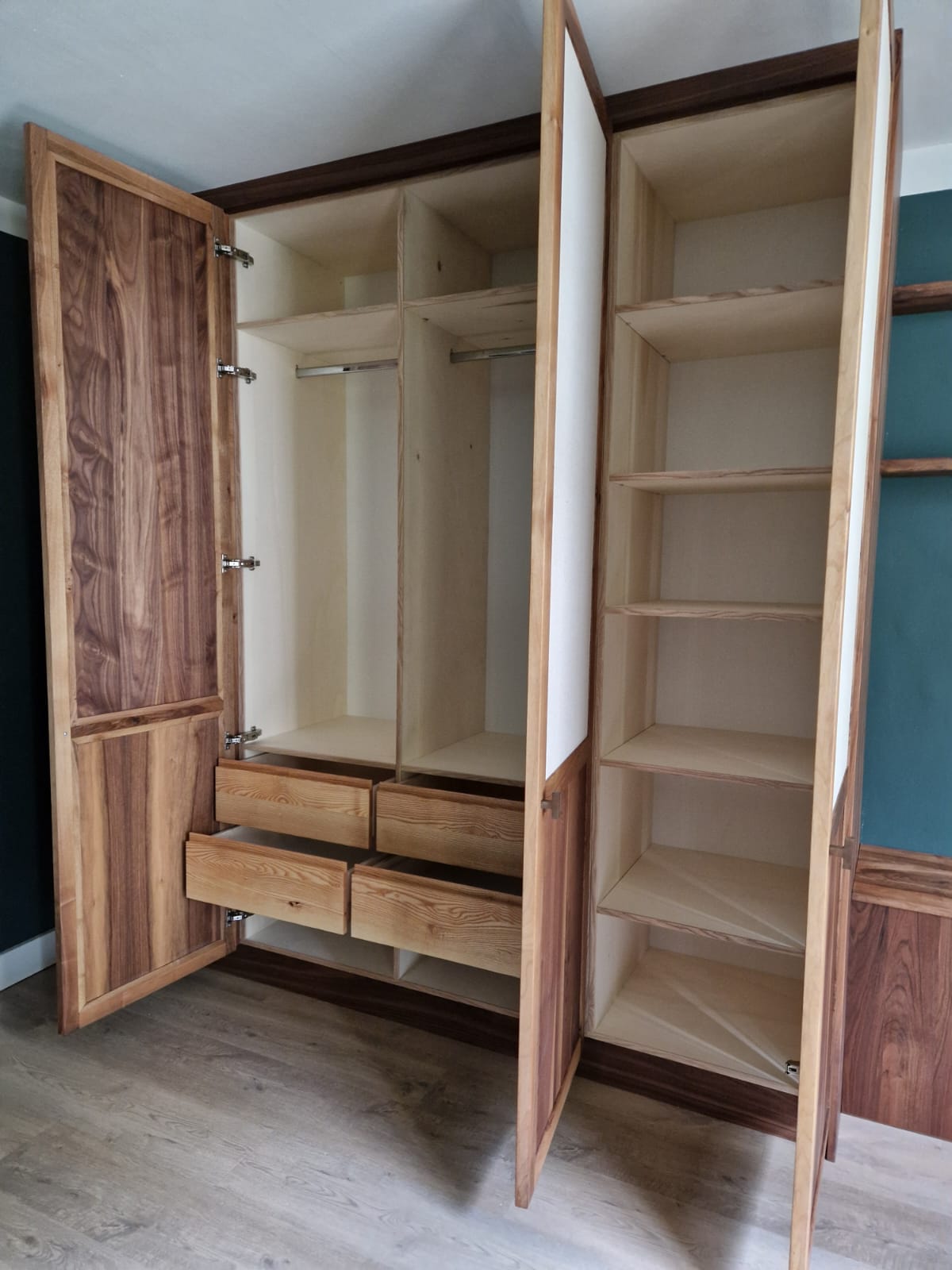 A custom-designed wardrobe system crafted in rich walnut, seamlessly integrating storage with a window-side bench. The piece features elegant cotton twill panel inserts that add texture and visual lightness to the sliding doors, beautifully contrasting with the warm walnut frame.